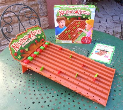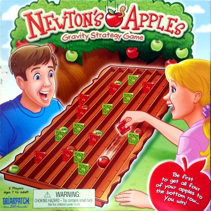 Newton’s Apples laisse une impression mitigée. D'une part, on est agréablement surpris par la qualité du matériel. D'autre part, on est un peu déçu par la règle qui aurait pu être simple mais qui comporte beaucoup trop d'exceptions et de cas spéciaux pour que le jeu reste fluide. L'idée est d'amener en premier ses quatre pommes en bas de la grille. Pour y parvenir, il faudra placer sa pomme au-dessus d'une de ses caisses que l'on écartera ensuite pour laisser tomber le fruit en bas de la grille. Les cas de blocage étant nombreux, l'auteur a été contraint d'ajouter de nombreuses règles spéciales et d'exception qui viennent malheureusement compliquer un jeu qui aurait dû rester simple. Il n'en demeure pas moins que le jeu est doté d'un matériel exceptionnel qui lui donne beaucoup de charme. Newton’s Apples n'a pas été publié en français mais vous trouverez une traduction dans les liens.