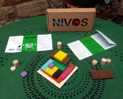 Sorti en 2015, Nivos a la même présentation que les autres jeux de son auteur-éditeur, Philippe Proux, à savoir une présentation éco-responsable, toute de bois de nos forêts et de carton recyclé. Si le jeu rappelle un peu Nasca, il en est très différent dans ses règles. Le but du jeu est de gagner le moins de points à la fin, ceux-ci étant représentés par des jetons de taille progressive : 1, 2, 3, 4, 5 et 6 points. Quand on joue à deux, il faut donc se concentrer sur l'objectif de ne pas ramasser plus de 10 points. À trois, il faut rester sous la barre des 7 points ou, en cas d'égalité, ne pas gagner le dernier jeton. On ramasse un jeton chaque fois qu'on attaque un nouvel étage, volontairement ou par contrainte. Mais on gagne aussi un jeton en fin de partie, quand on a posé toutes ses pièces et qu'il reste encore des jetons à prendre. D'où un décompte très complexe : faut-il mieux prendre tout de suite un jeton de faible valeur ou faut-il mieux poser cette petite pièce qui risque de me manquer par la suite ?