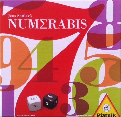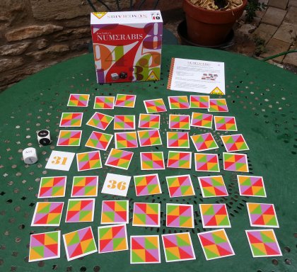 Numerabis est un jeu de mémoire et de calcul. Après avoir disposé les 49 cartes нumérotées de 1 à 49 face cachée, on lance deux dés. Le dé blanc indique les cartes qu'il faut trouver : paires, impaires, dont la somme est supérieure à 60, dont la somme est inférieure à 20, dont le total est divisible par 5, dont la différence est inférieure à 6. Le dé noir indique le type de jeu.