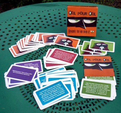 Lorsqu'il ne reste qu'un seul ovate, les druides ont gagné et le dernier ovate doit subir un gage. Mais un ovate surprenant un clin d'œil qui ne lui était pas destiné peut dénoncer le druide maladroit. La partie prend alors aussitôt fin. Si l'ovate ne s'est pas trompé, c'est le druide imprudent qui devra subir le gage. Sinon, c'est l'ovate, coupable de dénonciation calomnieuse, qui subira les foudres des dieux. Œil pour œil contient des cartes Druides et Ovates, ainsi qu'un assez grand nombre de gages. On peut décider, selon le public, d'en écarter certains ou de ne jouer que pour le plaisir de déterminer un perdant. Un bon jeu qui nous changera un peu des sempiternelles parties de Les Loups-Garous de Thiercelieux |