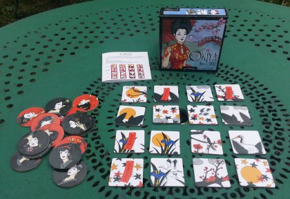 Comme Full Moon, chez le même éditeur, Okiya est une sorte de casse-tête pour deux joueurs. Après avoir tiré une situation de départ aléatoire, les joueurs vont essayer de l'analyser pour en tirer le meilleur profit. Celui qui aura le cerveau le mieux organisé l'emportera… ou verra qu'il a perdu si son adversaire joue au mieux. Après, tout réside dans la capacité à calculer les coups à l'avance. Le jeu est joli, avec ses décors inspirés du Hanafuda. Le thème est original, mais on a un peu de peine à se mettre dans la peau d'un maquereau (pardon, d'un responsable d'une maison de geishas). Le tout est indéniablement intelligent, mais un peu froid.