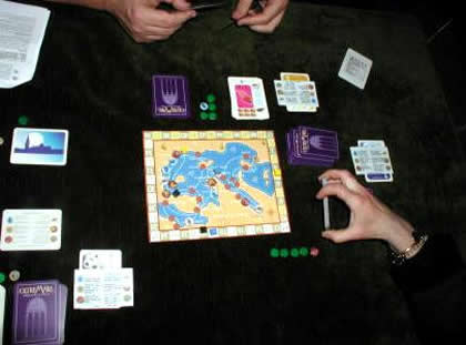 Ne voulant pas être la risée de mes camarades, je me suis donc à mon tour procuré une boîte auprès de mon vendeur-conseil favori, j'ai collé les petits autocollants sur les jetons, j'ai assemblé la carte (4 pièces de puzzle, prévoir 20 minutes) et j'ai joué… La ressemblance avec Bohnanza est évidente. On collecte des biens, dont il faut faire les plus grandes collections pour qu'ils rapportent plus. Mais là s'arrête la comparaison. Bohnanza est un jeu simple, très interactif. La phase de commerce y est ludique à souhait, et il est impossible de gagner sans faire des échanges en permanence.