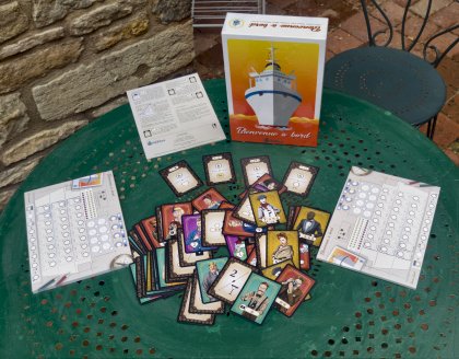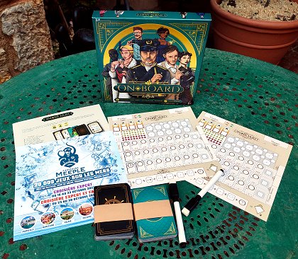 On Board a été créé comme cadeau de bienvenue pour les participants à la première croisière ludique organisée par Capitaine Meeple en mars 2019. Deux joueurs rivalisent pour remplir au mieux les cabines de leur paquebot, en essayant d'ouvrir les plus belles cabines et d'y loger des voyageurs fortunés. Les vacanciers ont trois passions : le jeu, la picole et faire de belles photos de couchers de soleil. Plus vous satisferez leurs demandes, plus vous marquerez de points. La mécanique du jeu est celle du partage de gâteau, popularisé par l'excellent . À tour de rôle, l'un des joueurs répartit les trois cartes piochées en deux paquets et l'autre choisit celui qui lui convient en premier. Si vous avez raté la croisière, vous pouvez peut-être trouver une boîte sur le stand du Capitaine Meeple dans les divers festivals ludiques.