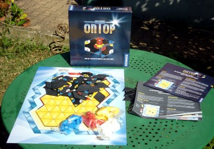 Un amateur comme moi des jeux de pavage ne pouvait pas passer à côté de On Top. Le matériel, soigné et un peu froid, n'est pas forcément attirant, mais cela a plutôt réussi à d'autres titres du même genre, comme Génial. Bien que le jeu ne comporte aucun texte, l'éditeur s'est limité à une version monolingue allemande. Les amateurs francophones devront donc se contenter d'une traduction non officielle des règles.