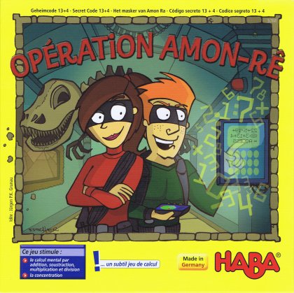 Dans Opération Amon-Rê, vous êtes des pilleurs de musée et vous devez défier les codes pour avancer dans les galeries. Pas très moral, mais bon… Les codes sont des nombres de 2 à 20, qu'il faut réaliser à l'aide de dés spéciaux et des quatre opérations. Les dés sont numérotés comme suit : 1 2 3 4 5 6 1 3 4 5 6 7 1 2 3 7 8 9 Le joueur dont c'est le tour lance tous les dés. Il essaye ensuite de réaliser la valeur du code qui est devant lui, avec les résultats obtenus. Parfois un dé suffit, parfois il en faut plusieurs, parfois c'est impossible. Si le joueur parvient à obtenir le code, il écarte le ou les dés utilisés et relance ceux qui restent pour s'attaquer au code suivant, etc. Le tour du joueur se termine quand il n'a plus de dé ou qu'il ne peut pas atteindre le code suivant avec ses résultats. Le premier arrivé au bout du périple gagne. Les jetons comportent deux faces, de valeurs très variables. On peut choisir les plus petits ou les plus grands nombres, ou laisser le sort décider. Opération Amon-Rê réussit le pari d'être agréable à jouer tout en entraînant aux opérations de calcul. Bravo !