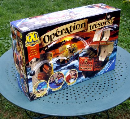 Quand on découvre l'imposante boîte d'Opération trésors !, on est en droit de se demander s'il s'agit d'un jouet ou d'un jeu. À première vue, on peut croire que Ravensburger s'est lancé dans la concurrence avec Playmobil. Mais dans la réalité, il s'agit bien d'un jeu de société, avec des règles précises. La différence, c'est que le plan de jeu mesure 1,60 m × 1 m, et que chaque bateau est long de 35 cm, large de 12 cm et haut de 27 cm. Cette dernière dimension n'est d'ailleurs que provisoire, puisque l'un des objectifs du jeu est justement de dégommer le drapeau pirate juché en haut du grand mât. Une tour est également fournie, qui possède deux trésors, un drapeau et un canon. À tour de rôle, les joueurs tournent une roulette, qui leur indique leurs possibilités de jeu : déplacement de navire, tirs de canon ou déplacement de la tour.