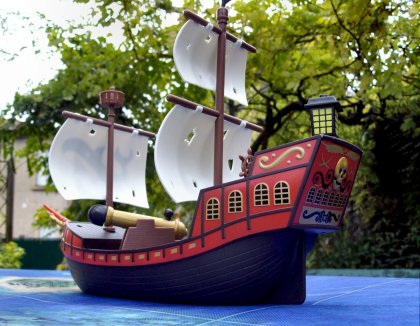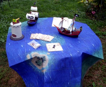 Le jeu comporte deux règles. La seconde est à objectif variable : chacun doit réaliser trois missions, qui peuvent être des objectifs à abattre ou des îles à rallier pour y embarquer du rhum ou des provisions. Un matériel impressionnant L'habitude veut que je montre les jeux posés sur la table de jardin verte. Le problème, c'est que dans le cas présent, on ne voit plus la table de jardin verte, ce qui vous donne une idée de la taille du jeu. Une fois les missions accomplies, le bateau rentre au port.