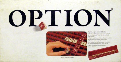 Les tentatives pour détrôner le fameux Scrabble sont nombreuses. Option se présente sous la forme d'un jeu de mots croisés, l'originalité étant que les lettres ont deux valeurs et deux couleurs possibles. On peut ainsi tourner une lettre à l'occasion de la pose d'un nouveau mot, à condition que tous les mots visibles ensuite restent valables. Une prime est accordée aux mots unicolores.