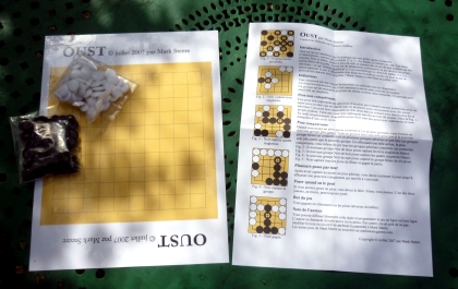 Malgré des apparences classiques, Oust est un jeu tout à fait inhabituel. D'une part, et bien que le tablier soit totalement inoccupé au départ, le but est d'éliminer toutes les pièces adverses. D'autre part, un joueur peut poser plusieurs pions à son tour, si le fait d'en poser un entraîne une capture de pièces adverses. Les joueurs les plus atteints s'adonneront à des parties interminables sur leur goban de 19 × 19 intersections. Un tablier de 11 × 11 me semble plus raisonnable. |