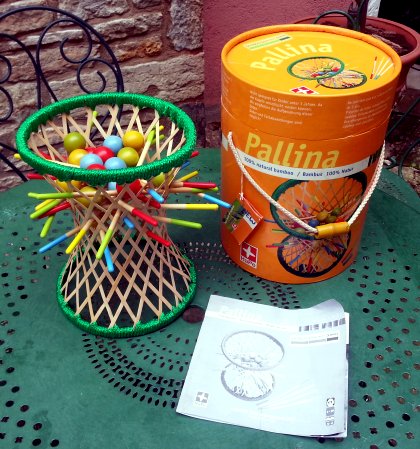 Pallina est très directement inspiré de Plunk. La différence vient essentiellement du matériel : une grande cage, des billes et des baguettes en bambou. Une bonne idée en apparence, mais un inconvénient majeur : les baguettes glissent facilement à travers les larges trous. Il faut donc les poser en les contraignant pour qu'elles ne bougent pas. |
