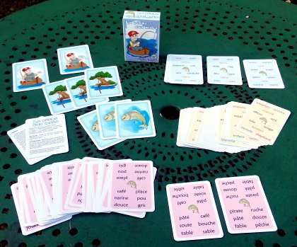 La Pêche aux mots est une adaptation du mécanisme initié par Colori et popularisé par Dobble : retrouver le même item caché sur deux cartes. Ici, on joue avec des mots. Deux difficultés viennent pimenter le jeu. D'abord, les mots « presque identiques mais pas tout à fait » sont nombreux. Ensuite, il n'y a pas toujours un mot présent sur les deux cartes. Il faut alors être le plus rapide à le découvrir pour gagner la manche. Les Nains versionsLes Nains versions est identique à La Pêche aux mots. Seul le thème change.