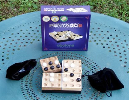Le but du jeu : une fois de plus, aligner cinq billes de sa couleur. Le petit plus, qui différencie Pentago des autres jeux de Morpion, c'est qu'après avoir posé sa bille, on doit tourner d'un quart de tour l'un des quatre morceaux du tablier. Jolie réalisation, mais pas aussi convaincant que d'autres jeux d'alignement. |