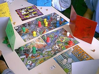 Car, j'ai oublié de vous le dire, et c'est là que réside tout le plaisir du jeu, la règle de l'art consiste à fabriquer les blocs, en enrobant un petit cube de bois avec de la pâte à modeler. Seulement, ce n'est pas comme ça qu'on va gagner sa vie ! Pour économiser sur les matériaux, on construit donc des blocs entièrement faits de pâte à modeler. Mais gare au contrôle ! L'inspecteur peut vérifier la construction avec un puissant scanner de chantier : en l'occurrence, un scanner qu'il enfonce dans un bloc pour vérifier s'il est armé ! Un jeu incontournable ! En vente chez tous les bons marchands de jeux, mais dépêchez-vous, le jeu est de 1992, il ne doit pas en rester beaucoup d'exemplaires. Il en restait un exemplaire chez mon fournisseur préféré, Jeux Descartes à Lyon, mais je crois qu'il est maintenant parti. |