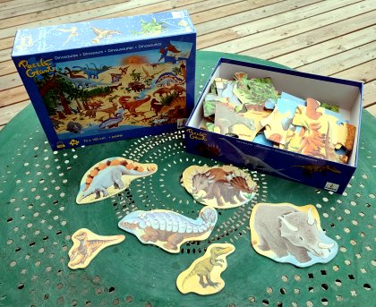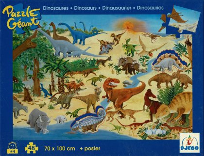 Puzzle géant - Dinosaures, Puzzle géant - L’Océan et Puzzle géant - L’Afrique partagent le même concept : un puzzle composé de 42 pièces plus 7 pièces-silhouettes avec des animaux qui viennent s'imbriquer au milieu des autres. Grands herbivores et prédateurs cohabitent gentiment au pays des bisounoursaures.