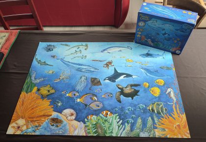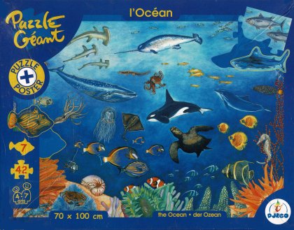 Puzzle géant - L’Océan, Puzzle géant - Dinosaures et Puzzle géant - L’Afrique partagent le même concept : un puzzle composé de 42 pièces plus 7 pièces-silhouettes avec des animaux qui viennent s'imbriquer au milieu des autres. Les animaux qui vivent plutôt dans des mers froides fréquentent ici des habitués des mers chaudes, au sein d'un océan universel.