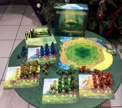 "Tree, Hexes and Sun" pourrait être le slogan de Photosynthesis. Un vrai jeu combinatoire se cache derrière les jolis arbres en telle quantité qu'ils justifient la grande boîte. Aucun hasard donc. Et en particulier pas de météo aléatoire : le soleil est de même force à toute heure. Le but du jeu : gagner des points de victoire, essentiellement en procédant à la coupe de grands arbres ayant atteint leur plus belle taille. Mais ce faisant, on se privera de revenus du soleil. Les mécanismes sont réellement astucieux. Les arbres qui reçoivent le soleil font gagner des points d'action. Ces points permettent de faire évoluer sa population en semant des graines ou en faisant croître les arbres. En même temps, il faut gérer ses réserves habilement pour ne pas être à court de ressources. Les parties sont courtes et il ne s'agit pas de perdre le moindre temps à faire pousser des arbres peu rentables. On progresse à chaque partie mais, hélas, les adversaires aussi !