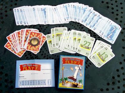 Le problème, c'est qu'il ne faut pas s'arrêter sur une carte possédée par un joueur, et figurant une île numérotée de 10 à 30. Au début, chacun reçoit une île qu'il montre à tous. Puis les îles sont cachées en main. À chaque fois qu'on dépasse 30 ou qu'on descend sous 10, une nouvelle île est attribuée, rapidement montrée puis masquée. Il devient de plus en plus dur de tout mémoriser, et même de poser une carte quand on retient tout. La mémoire joue indéniablement un rôle ainsi que le hasard. Mais la part de décision reste importante, et surtout le bonheur de jouer est là, petits et grands joueurs réunis dans le même plaisir simple. Encore un jeu indispensable en vacances… Vous trouverez parfois le jeu dans sa version allemande, appelée Fettnapf… in sicht. |