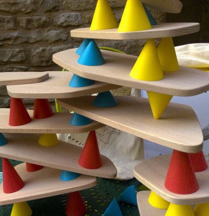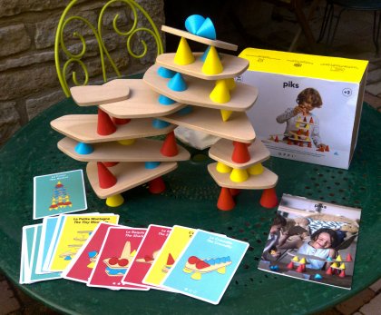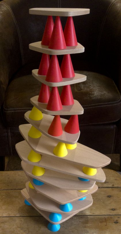 Les cônes en silicone présentent l'avantage d'être antidérapants. Mais au-delà d'une certaine pente, la gravitation reprend ses droits. Jouer à plusieursLe livret propose une règle de jeu simple. Chaque joueur à tour de rôle doit poser trois cônes et une plaquette sur une tour de plus en plus haute. Celui qui provoque la chute de l'édifice perd la partie. Je vous propose une règle de jeu pour 2 joueurs, un tout petit plus élaborée, que j'ai appelée Piks Chiche.