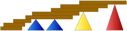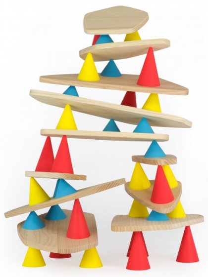 Le jeu est proposé en diverses configurations, allant de 24 à 128 pièces. On trouve toujours une proportion de trois cônes en silicone pour une planchette en hêtre. Une des premières notions que le jeune enfant va acquérir, c'est qu'il faut trois points d'appui pour poser une planche ! Les planchettes ont des formes variées et une épaisseur de 8 mm. Les cônes bleus mesurent 24 mm de haut, les jaunes 40 mm et les rouges 56 mm.