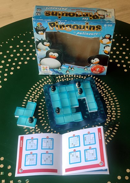Publié 10 ans avant Le Festin des chenilles et La Cité d’Or, Les Pingouins patineurs mettait déjà en œuvre un concept intéressant dans les casse-tête de placement : les pièces transformables par pivot ou coulisse. Ici, ce sont cinq pièces en forme de pentaminos dont une partie (un ou deux carrés) peut coulisser. Chaque pièce est occupée par un pingouin, ce qui est un indice ou une contrainte – voyez cela comme vous voulez – pour la résolution des défis. À jouer en été pour se rafraîchir un peu.