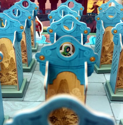 Vue ! Notre princesse voyage donc par le moyen de permutations successives de pions, en essayant de passer inaperçue. Mais des porteurs de miroirs parcourent aussi le palais impérial. Lorsqu'ils se placent en face de la princesse, ils en dévoilent la position. Aïe ! La règle avancée introduit de nouveaux personnages qui compliquent un peu la quête de notre princesse. Très belle réalisation.
