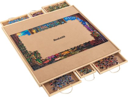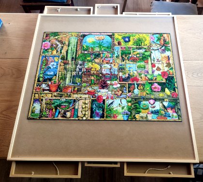 Le modèle choisi a une dimension de 80 × 80 cm, ce qui permet de loger n'importe quel puzzle de 1000 pièces. Le plateau est pourvu d'un revêtement antidérapant, est monté sur un dispositif rotatif et possède 6 tiroirs permettant de trier facilement les pièces.
