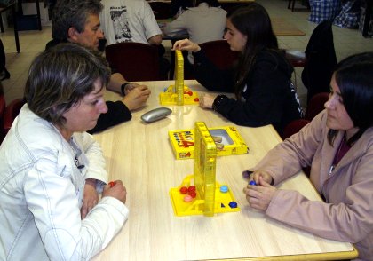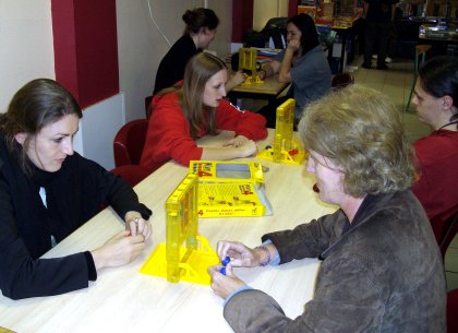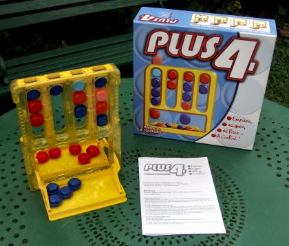 Ce qui change tout : Dès lors, tous les modes de raisonnement du Puissance 4 sont inopérants à Plus 4. Et j'en parle en connaissance de cause, puisque je me prends une piquette systématique contre au moins deux joueurs, qui ont certainement compris mieux que moi les mécanismes spécifiques de ce jeu. Les parties s'enchaînent rapidement, et plusieurs variantes sont proposées : jeu simple ou continu, utilisation de pions spéciaux. Plus 4 est à mon avis une des nouveautés les plus intéressantes de l'année 2007. Le public a d'ailleurs été conquis au Festival de Parthenay, puisqu'il lui a décerné un Trophée FLIP. 1er Open International de FranceN'ayons pas peur des mots. Une pratique courante de quelques ludojacobins est d'organiser, dans l'arrière-salle d'un café parisien, un tournoi avec une demi-douzaine de potes, qu'ils baptisent pompeusement « Championnat de France ». Soucieux de ne pas les concurrencer, nous avons appelé « Open International » le sympathique tournoi de Plus 4 organisé lors du week-end Rêves de Jeux, au printemps 2008 à Bourgoin. « Open » car tous pouvaient participer, même ceux qui ne le voulaient pas. « International » puisque des concurrents venaient d'Irlande, de Suisse, du Canada et même d'Auvergne.