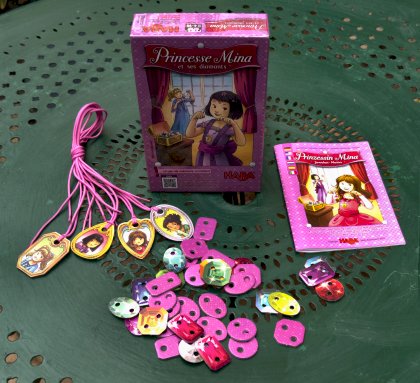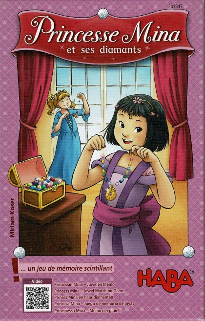 Princesse Mina - et ses diamants est un jeu de mémoire assez classique, où il s'agit de retrouver des bijoux identiques pour les enfiler sur son collier. Hors de question de faire des bijoux fantaisie ! les joyaux qui se font face à droite et à gauche de l'amulette centrale doivent être de forme et de couleur identique ! La tâche est facilité par le dos des pierres qui indiquent la forme. Mais dans chaque forme — ovale rond, rectangle, carré — se cache une pierre noire qui n'a aucune valeur, et dont il faudra mémoriser l'emplacement si quelqu'un la tire. Un jeu tout
