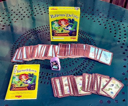 Potions’ Délire est un jeu totalement chaotique destiné aux jeunes joueurs. À vrai dire, je ne sais pas vraiment si "chaos" et "jeu pour enfant" s'accordent véritablement. Tous les joueurs retournent simultanément la première carte de leur pioche personnelle. Chacun peut alors s'emparer de la carte de n'importe quel joueur si elle convient à sa recette. Prévoyez quelques sparadraps… Ou envisagez d'imaginer une autre règle plus calme.