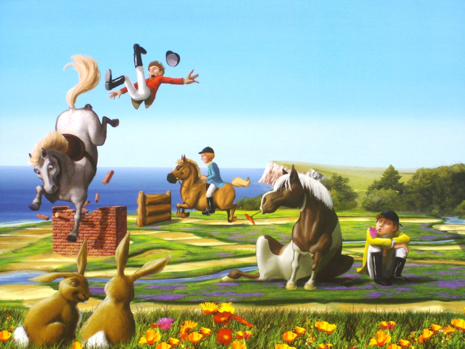 Le plan de jeu représente une course de poney avec quelques obstacles fixes : objets placés sur
