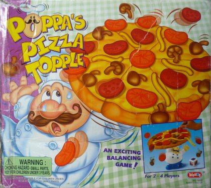 Poppa’s Pizza Topple est un classique jeu d'équilibre qui rappelle un peu Bamboleo. Après avoir pris l'apéritif chez Max le serveur, vous voici donc rendus chez Poppa, le roi de la pizza. Pour gagner, il faudra être le dernier en jeu. À tour de rôle, les joueur lancent le dé et agissent selon le résultat. S'ils tirent le chef, ils sont dispensés de poser un ingrédient. S'ils tirent le joker, ils choisissent un ingrédient et le posent sur la pizza. S'ils tirent un ingrédient, ils doivent le poser sur la pizza. Il n'y a pas de contrainte de pose. On peut même superposer les tranches de tomate. La pizza tient en équilibre sur le doigt de Poppa. Lui-même tient solidement sur ses pieds, mais il est possible de le poser à même la table de jeu, sans ses pieds, ce qui rend l'ensemble encore plus instable.