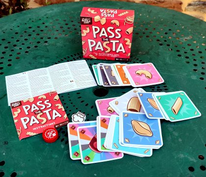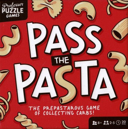 Pass the Pasta est un petit jeu de collecte sans prétention. L'objectif est de poser des séries de une à sept cartes identiques pour créer des collections de pâtes ou les compléter par la suite. Alternativement, on peut prendre, parmi les seize cartes exposées en carré, autant de cartes identiques que l'on souhaite, à condition que ces cartes soient dans la même ligne ou la même colonne que la toque de cuisinier posée par le joueur précédent, et sans jamais dépasser sept cartes en main. Un jeu familial qui ne casse pas trois pâtes (jeu de mots facile, j'en conviens).