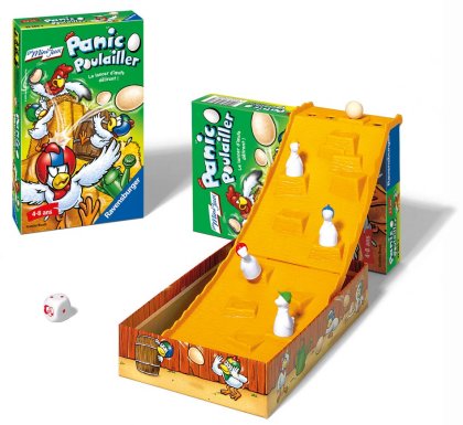Le principe est identique, seul le circuit est plus simple. Cela lui permet de tenir dans une petite boîte, elle-même astucieusement utilisée pour servir de support au toboggan. On retrouve le même coq irascible, mais il ne tyrannise plus que quatre poules.