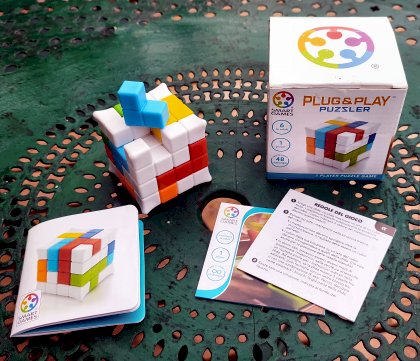 L'idée est de ranger les 8 éléments colorés – 2 pièces de 5 cubes, 4 pièces de 4 cubes et 2 pièces de 2 cubes – dans le grand cube blanc évidé. Rien de vraiment difficile. Mais là où ça se corse, c'est que l'auteur du casse-tête a imaginé 48 situations imposées de départ pour lesquelles il n'existe qu'une seule solution. Comme d'habitude chez Smart Games, les défis sont classé par ordre de difficulté croissante.