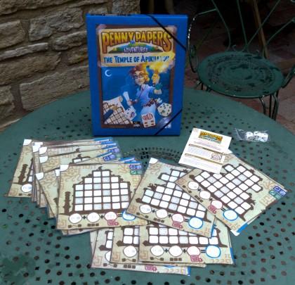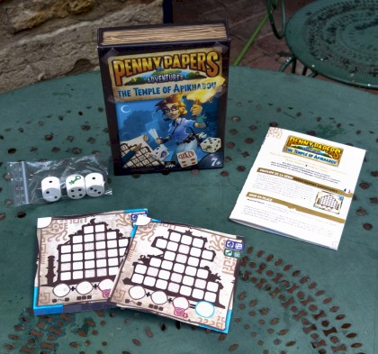 Penny Papers Adventures - The Temple of Apikhabou est le jeu le plus abordable de la collection Penny Papers. Le but est de créer la plus longue chaîne de numéros croissants consécutifs, ainsi que des triplettes différentes de nombres identiques. Le jeu est accessible même pour les joueurs assez jeunes. Il ne faut pas s'obnubiler sur la chaîne, les triplettes rapportent plus facilement des points. Version XXL pour l'Escale à jeux