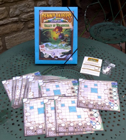 Les jeux de la collection Penny Papers fonctionnent de la même manière. On lance les trois dés puis chacun choisit de les utiliser comme il le souhaite. Si un dé rouge apparaît, toutes les feuilles sont posées et mélangées face cachée au centre de la table, chacun en tire une, applique la pénalité dans la case de son choix puis tous récupèrent leur feuille initiale pour continuer la partie. 2018 : Penny Papers Adventures - The Valley of Wiraqocha