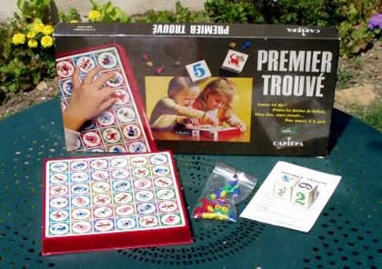 Dans Premier trouvé, deux gros dés indiquent une combinaison entre une image et un chiffre. Il faut être le premier à trouver la case correspondante pour y placer sa fiche. Pour compliquer la tâche, des couleurs viennent embrouiller la vue.