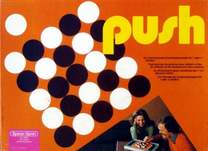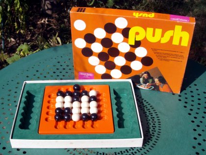 Publié en 1977, Push appartient à la grande famille des jeux de taquin. On trouve déjà le mécanisme de poussée de billes, qui fera plus tard les beaux jours de jeux comme Akiba, Abalone ou Aboculis.