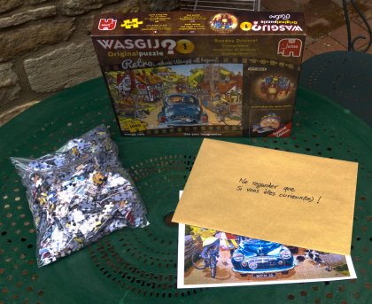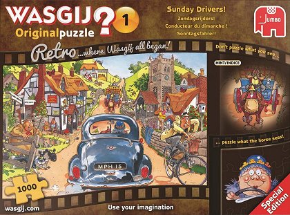 Puzzle - Les Conducteurs du dimanche (Sunday Drivers!) est un Puzzle Wasgij de 1000 pièces de la collection "Original". Description par l'éditeur : « Le soleil brille sur ce sympathique petit village et le fermier du coin avance doucement sur la route avec ses chevaux et sa charrette. Il aperçoit tout à coup une veille dame au volant d’une Minor Morris, roulant droit vers lui. Dans peu de temps, ce village paisible sera en proie à ce qui se trouve derrière la voiture de la vieille dame. Imaginez-vous conduisant la charrette et essayez de deviner ce qui se passe derrière la Morris Minor, mais aussi les problèmes qui attendent ce charmant village. Vous trouverez la réponse en reconstituant le puzzle. » Dimensions : 68 × 49 cm