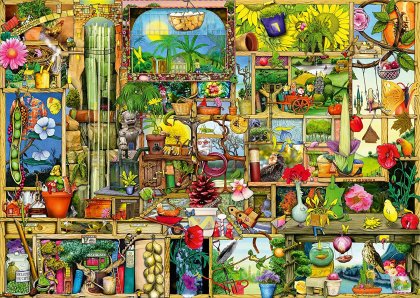 Colin Thompson est un écrivain et illustrateur anglo-australien de livres pour enfants. Il a publié plus de 70 œuvres et dessine également des images pour des puzzles. Puzzle - Cuisine et Jardin propose deux puzzles très similaires de 1000 pièces, chacun d'une dimension de 50×70 cm. Jardin :
