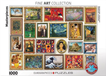 Puzzle - Chefs d’œuvre - Masterpieces est un puzzle irrégulier de 1000 pièces représentant une exposition de 22 tableaux tous célèbres. De gauche à droite et de bas en haut, on retrouve :