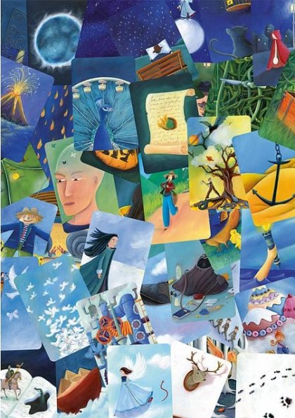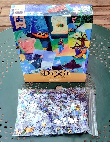 Puzzle Dixit - Blue Mismatch est un puzzle régulier de 1000 pièces dans lequel vous pouvez retrouver un camaïeu bleu de quelques cartes du jeu Dixit illustrées par Marie Cardouat.