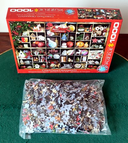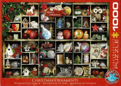 Puzzle - Décoration de Noël - Christmas Ornaments est un puzzle irrégulier de 1000 pièces, représentant un pêle-mêle de décorations de Noël.