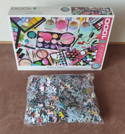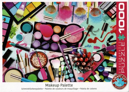 Puzzle - Palette de couleurs de maquillage - Makeup Palette est un puzzle irrégulier de 1000 pièces, représentant un pêle-mêle d’accessoires de maquillage.