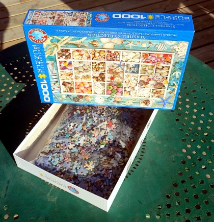 On évitera d'y jouer à la plage ! Les pièces irrégulières et la grande ressemblance entre les divers coquillages en font un puzzle vraiment difficile malgrè le nombre de pièces assez réduit. Dimensions terminées : 68 × 48 cm