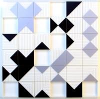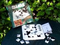 J'avais moi-même des préjugés négatifs avant d'essayer Quads. Le jeu n'est pas vraiment beau, et le matériel ne fait pas rêver. J'y joue avec beaucoup plus de plaisir maintenant qu'il est doté d'une version en bois et, qui plus est, d'une boîte bien plus agréable. Quads est donc un excellent jeu du toujours brillant Kris Burm ! Les pièces sont constituées de morceaux foncés pour un joueur, et clairs pour l'autre, sur un fond strié. Le sens de la trame est important : on ne peut pas abouter des morceaux striés différemment : les traits verticaux doivent s'ajuster à d'autres traits verticaux.