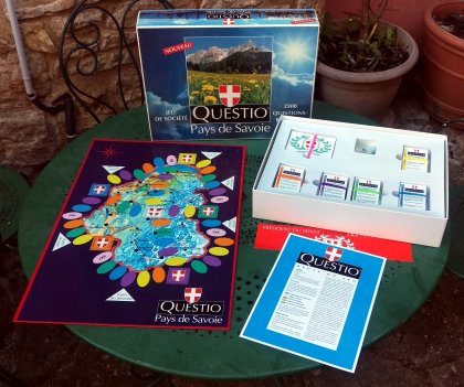 La grande boîte de Questio - Pays de Savoie est consacrée, vous en doutiez ?, aux deux Savoies. D'après la notice, plus de 600 personnes ont participé à élaborer les questions. Les questions sont de difficulté très variée. Avec un peu de chance vous devrez dire à quelle région appartient la Savoie. Si vous avez moins de chance, vous devrez donner le nom de l'épouse du duc Amédée IX.