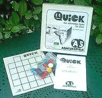 Quick est un jeu rapide, comme l'indique son nom. Un joueur dispose au hasard les jetons colorés. Son adversaire pose son pion sur un jeton, puis il fait de même. Chacun à son tour déplace ensuite son pion en enlevant celui sur lequel il était. Le but est de prendre l'autre soit en allant dessus, soit en allant sur un jeton de même couleur. Un joueur qui ne peut plus jouer a également perdu. On s'aperçoit rapidement que pratiquement tous les coups sont forcés et automatiques. En fait tout est dans le choix de la case de départ, à l'occasion duquel il faudrait anticiper tous les mouvements de l'adversaire. Ce qui fait que Quick, qui est un jeu très rapide mais hasardeux, peut devenir un jeu très lent et très pénible à jouer, si on tombe sur un partenaire qui aime réfléchir… |