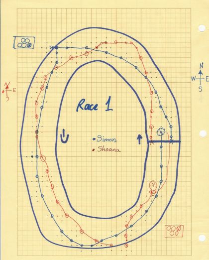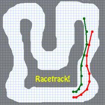 Nombre d'entre nous ont joué aux courses de voitures sur papier, connues en anglais sous le nom de Racetrack. Le principe en est simple. On dessine un circuit sur du papier quadrillé puis on lance la course. Au départ, la vitesse est nulle. À chaque tour, on peut augmenter ou diminuer de 1 le vecteur de vitesse dans chacune des directions. Par exemple, si la vitesse est actuellement de +3/-2 (2 cases vers la droite et 3 vers le bas), on peut passer à :