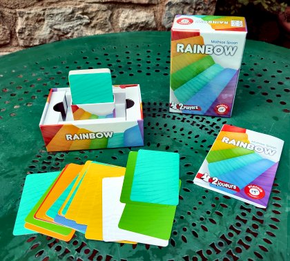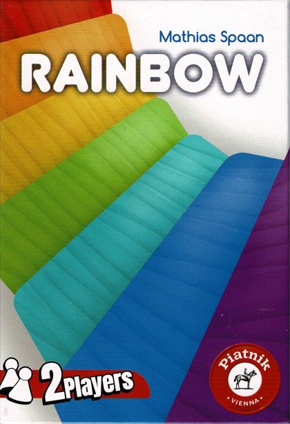 Difficile de concevoir un matériel plus simple que celui de Rainbow : 57 cartes double-face avec simplement une couleur sur chaque face. Comme il n'y a aucune inscription, les cartes sont à la fois internationales et adaptées aux droitiers comme aux gauchers Rainbow se joue à deux. Chacun tient ses cartes de sorte qu'il n'en voit que le recto tandis que son adversaire voit le verso. Les faces peuvent être de sept couleurs différentes, plus le blanc (joker) et le noir (malheur !). Le but est de gagner le plus de cartes. Il existe deux façons de gagner des cartes. La manière noble consiste à poser la sixième carte sur la table en prenant garde qu'il y ait six couleurs différentes, sans carte noire. La manière mesquine consiste à attendre que son adversaire se vautre pour récupérer toutes les cartes sur la table. L'adversaire (pas vous, bien sûr) se vautre lorsqu'il révèle une carte noire ou d'une couleur déjà visible. Tout ça semble simple, mais la règle est bien tordue. Lorsqu'on pose une carte, on doit décider de la poser avec la face visible que l'on connaît ou l'autre face en espérant qu'elle convienne. On peut commencer par retourner une carte déjà posée, sans obligation. Si tout s'est bien passé, on peut continuer en posant une seconde puis une troisième carte, mais il faut dans ce cas obligatoirement retourner d'abord une carte déjà posée. Rainbow c'est un agréable mélange de chance, de mémoire, de calcul, de prise de risque pour des parties de rigolade à deux. Je vous préviens, vous allez en voir de toutes les couleurs !